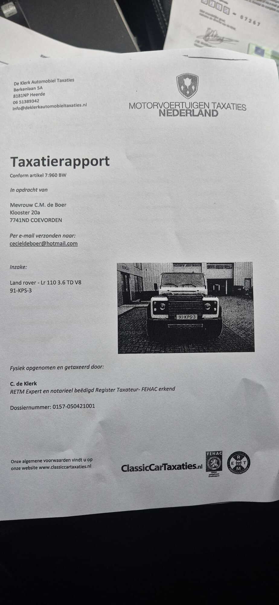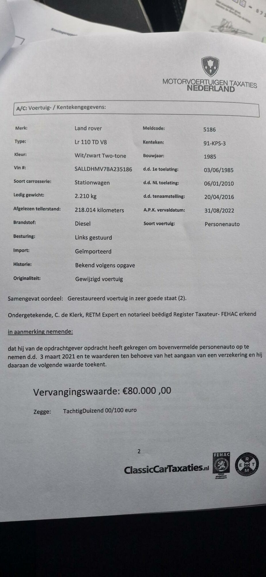 Taxatieraport met daarop vermelde vervangingswaarde van 80.000,-